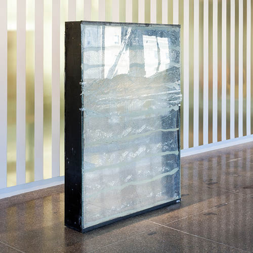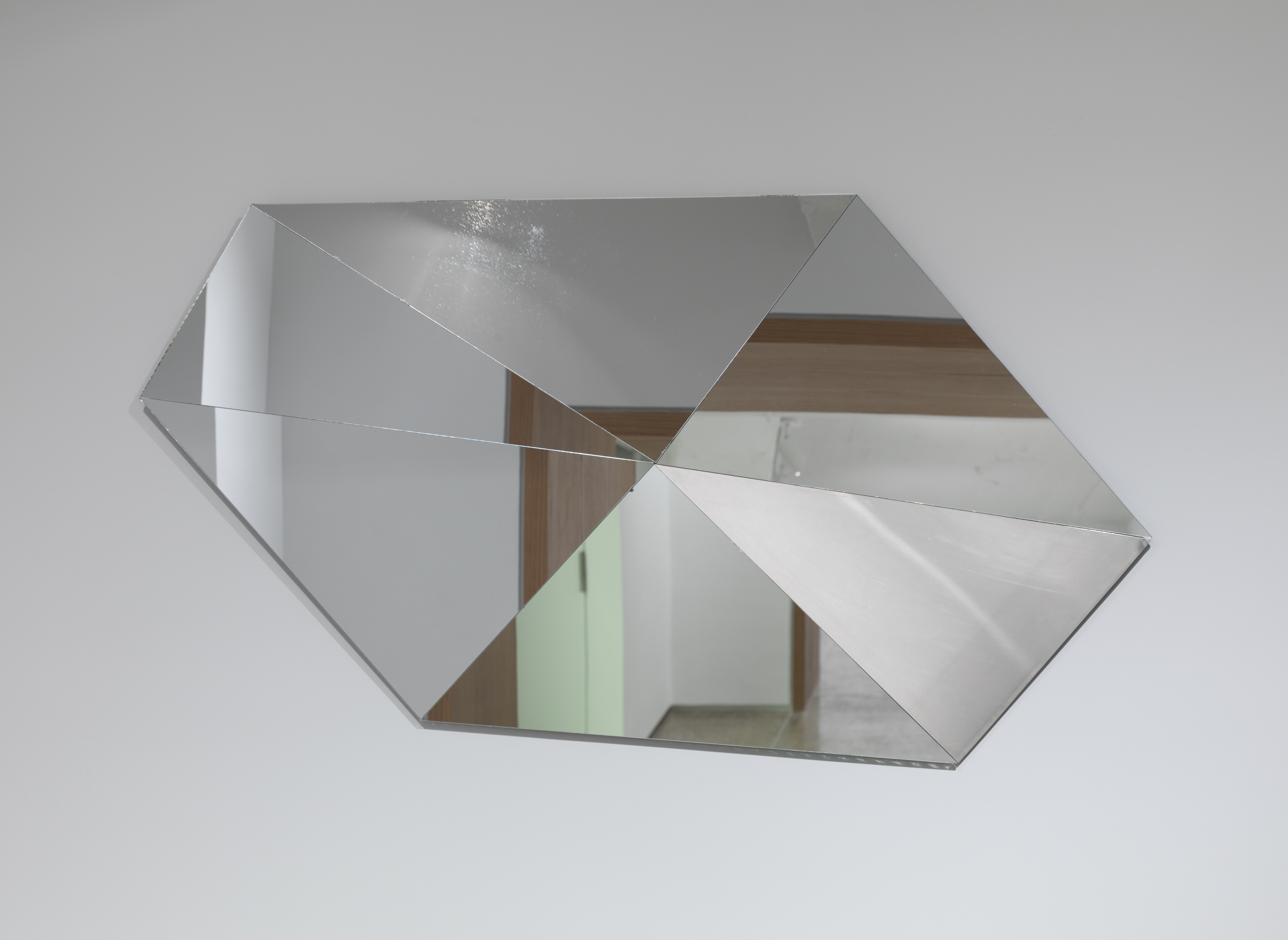 Exhibit 01: Space provides a novel perspective. Architectural elements, verticality, and form all echo between work and space. Buren’s brass stripes, Tuazon’s broken mirrors and glass, Judd’s cold aluminum, and Guyton’s inky voids both reflect and deflect their surroundings, from the gallery walls to the viewers within.